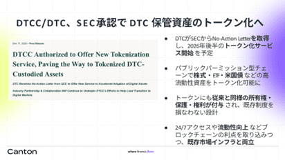 - DTCC/DTC は SEC から No-Action Letter を受領し、株式・ETF・米国債など高流動性資産のトークン化を進めている
