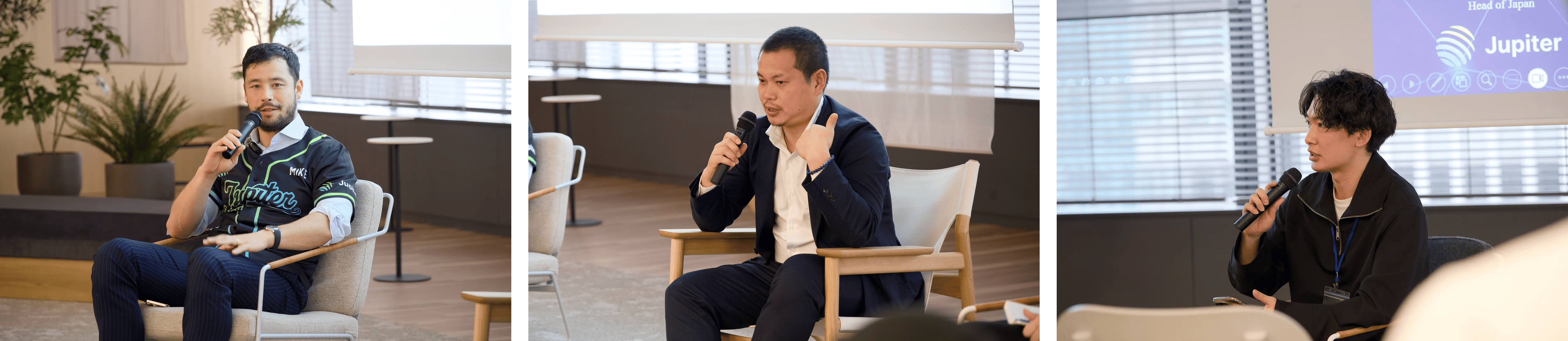 本セッションでは、JETの鈴木敦史氏およびJupiterのMike Eidlin氏がスピーカーとして登壇し、Uniswap LabsのDaiki氏がモデレーターを務めました。Solana DeFiのインフラ進化やプロダクト開発戦略、日本市場でのユースケース可能性について議論が行われました。
