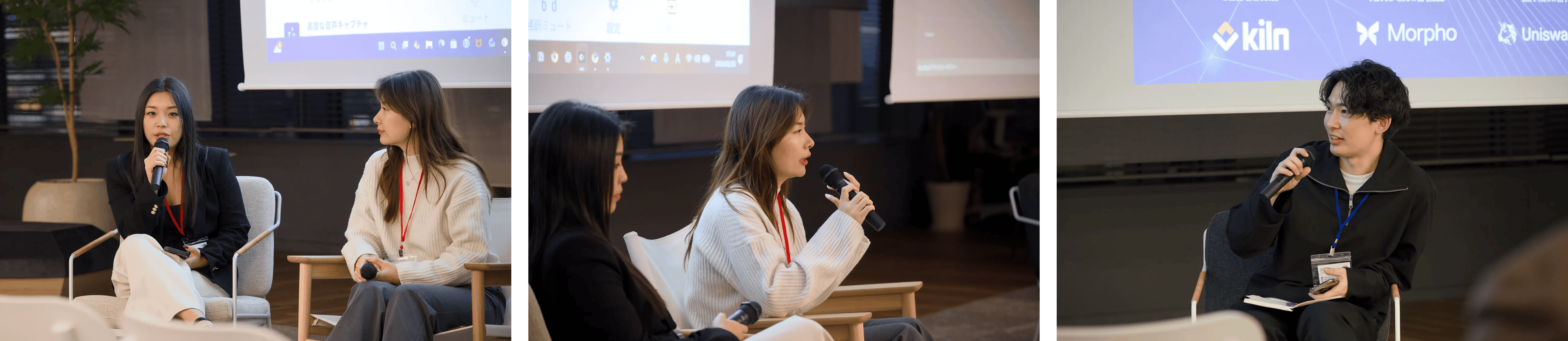 本セッションでは、KilnのCherry Yim氏およびMorpho LabsのShan Shan Shui氏がスピーカーとして登壇し、Uniswap LabsのDaiki氏がモデレーターを務めました。海外における伝統金融とDeFiの連携事例が紹介され、機関投資家向けインフラの整備や実装事例について具体的な共有がありました。