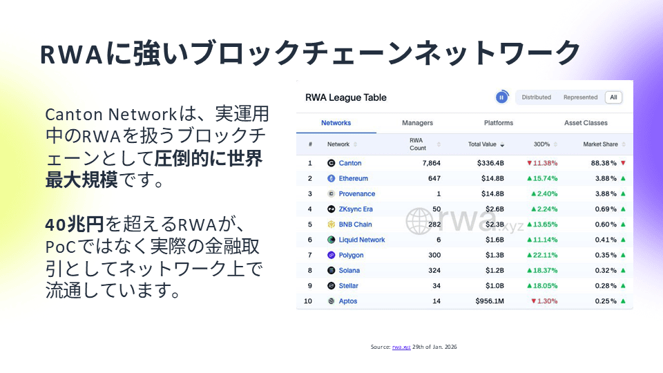 - RWA 分野において、40 兆円超の資産が PoC ではなく実際の金融取引として流通している