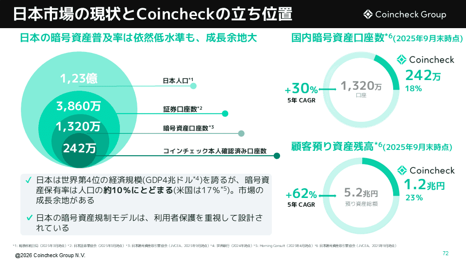 - 国内約 1,320 万口座のうち、約 242 万口座をコインチェックが占め、預かり資産残高は約 1.2 兆円に達している